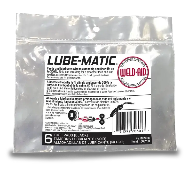 For all types of steel wire including solid and fabricated. Each black pad is pre-treated with Lube-Matic® liquid allowing for smooth feeding of wire with poor cast, poor helix, rust or long feed liners. 6 pads per pack. Not recommended for aluminum.